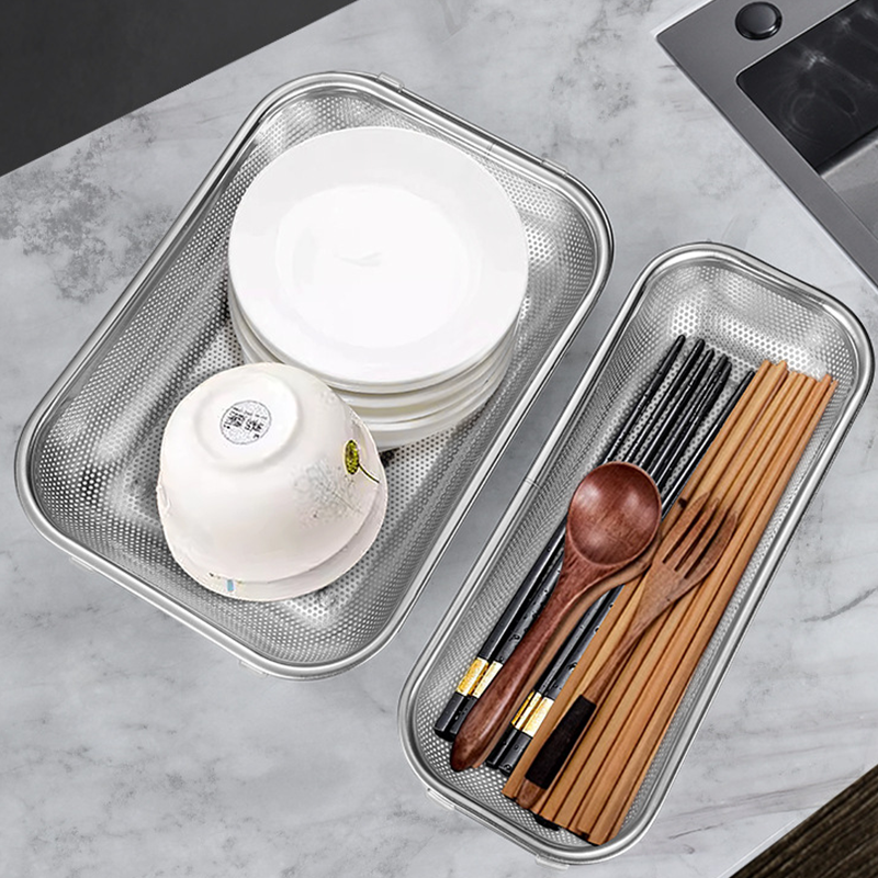 MULTI-FUNCTIONAL DRAINING & STORAGE: Fine perforated mesh allows rapid water drainage while securely holding small items like chopsticks, cutlery, or delicate produce. Doubles as a storage tray for fruits, vegetables, or dishes, enabling versatile use beyond basic draining tasks.