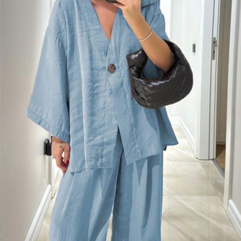 Women's V-Neck Top & Wide-Leg Pants Solid Color 2-Piece Set